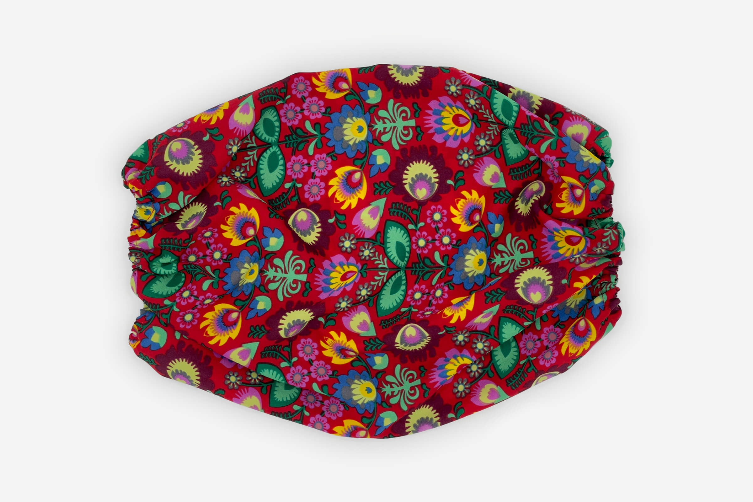 Ušanka s výrazným lidovým vzorem na červeném pozadí. Vyrobena z velmi lehkého, vzdušného materiálu ideálního pro celodenní nošení.