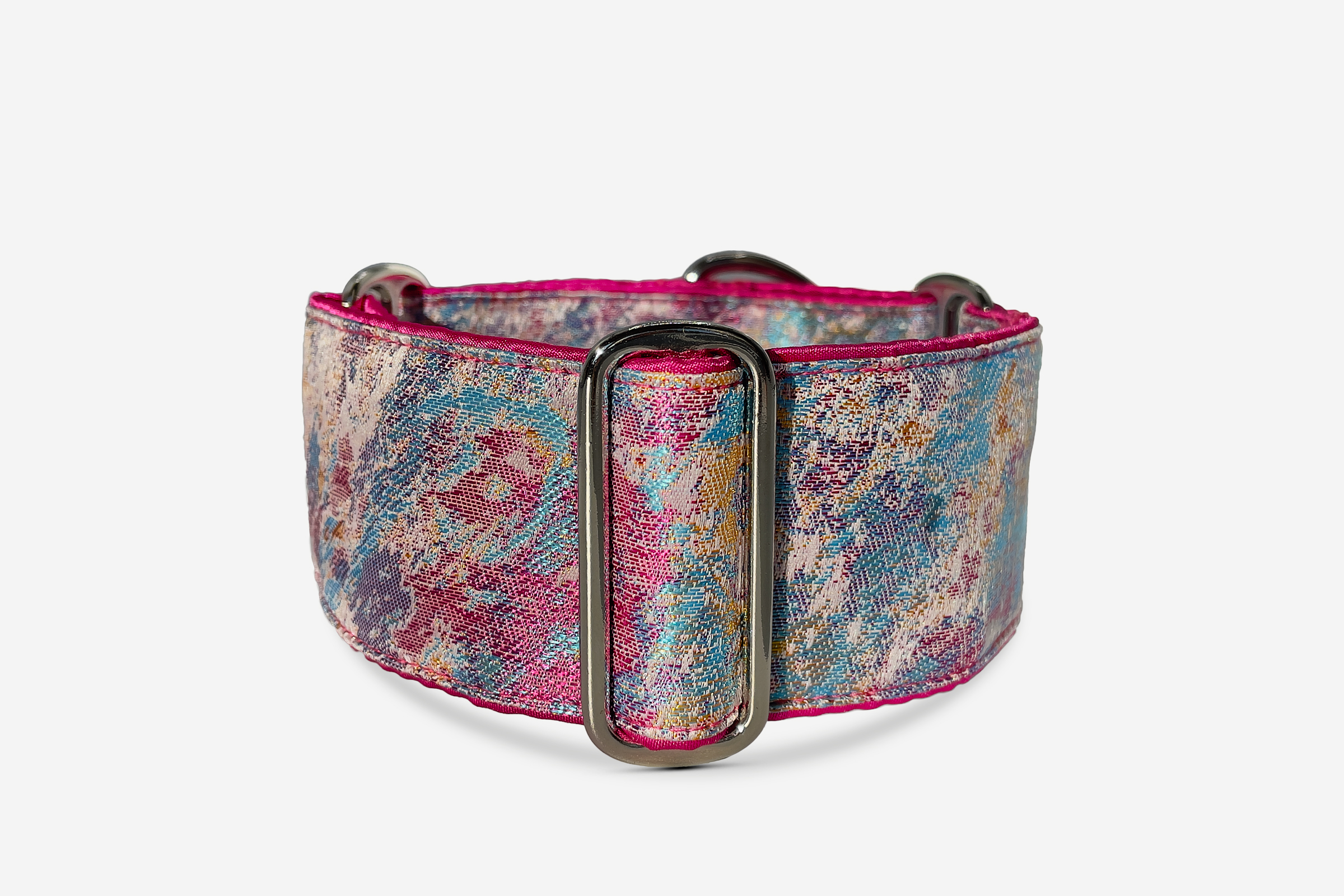 Naše obojky jsou vyrobeny z tkaných brokátových látek a podšité saténem. Používáme ve výrobě obojků vysoce kvalitní kování a extra silné nitě, abychom zajistili tu nejlepší bezpečnost produktu. Některé borkáty jsou jemnější struktury a nelze je doporučit pro každodenní nošení.